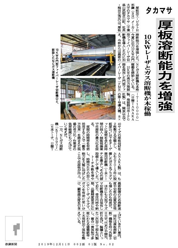 2019年12月11日付 鉄鋼新聞に掲載 厚板溶断能力を増強