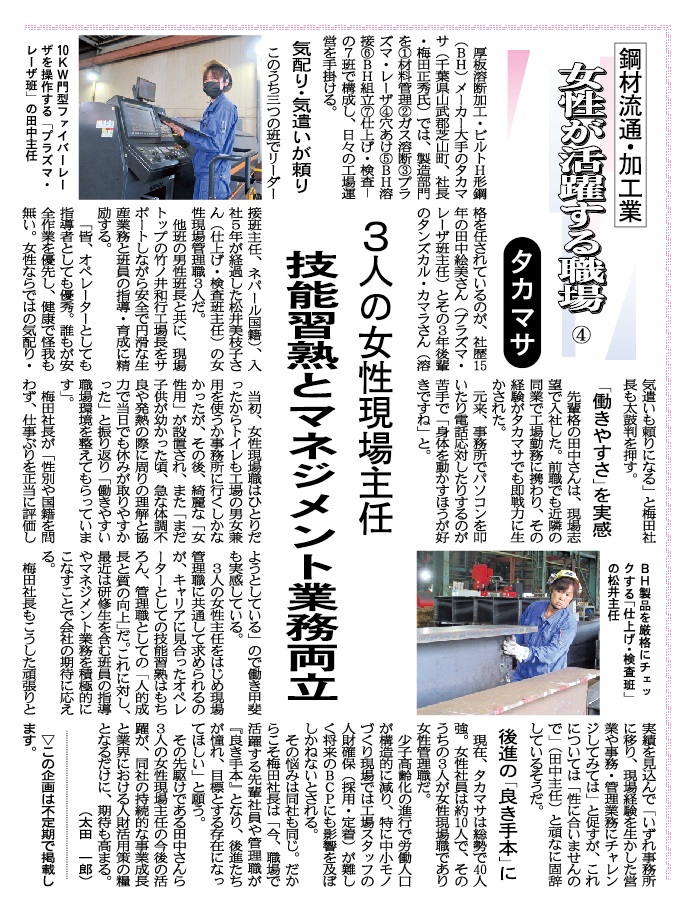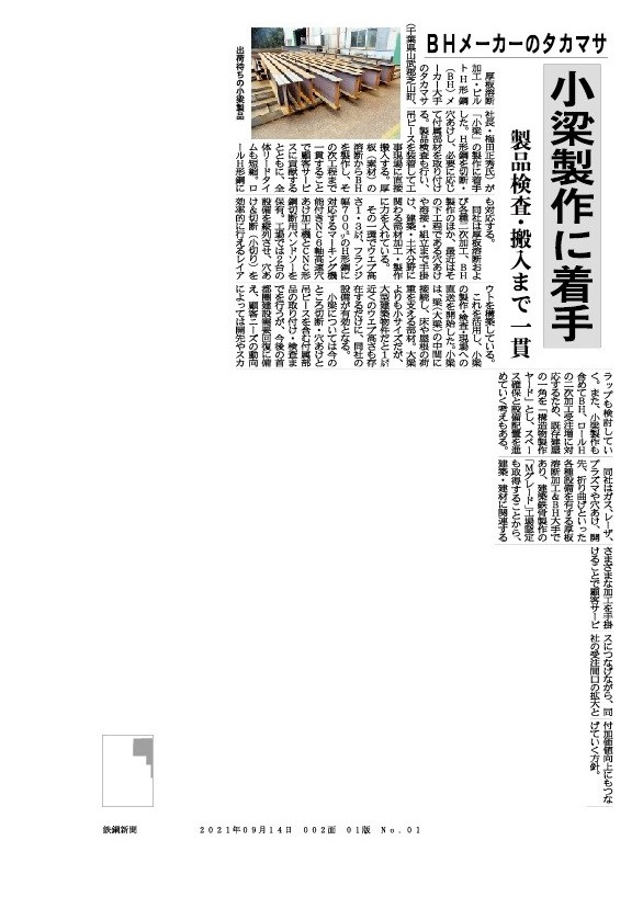 2021年09月14日付 鉄鋼新聞に掲載 BHメーカーのタカマサ/小梁製作に着手/製品検査・搬入まで一貫