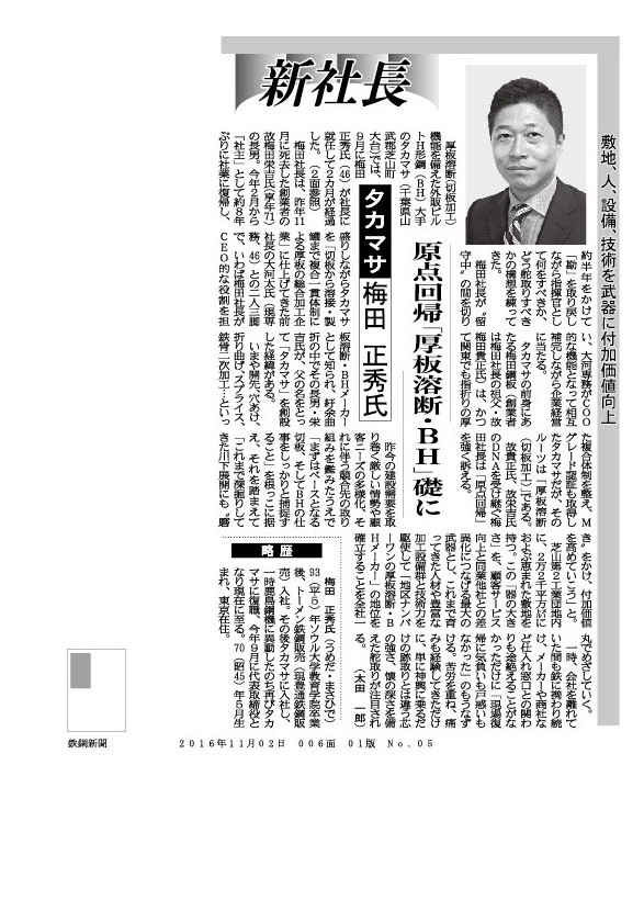 2016年11月02日付 鉄鋼新聞に掲載 【新社長】 ー 原点回帰「厚板溶断・BH」礎に ー