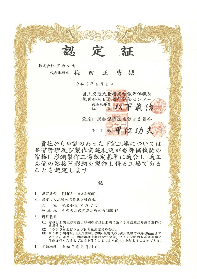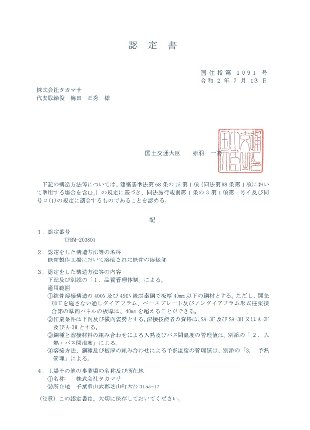 国土交通大臣認定鉄骨製作工場Mグレード更新