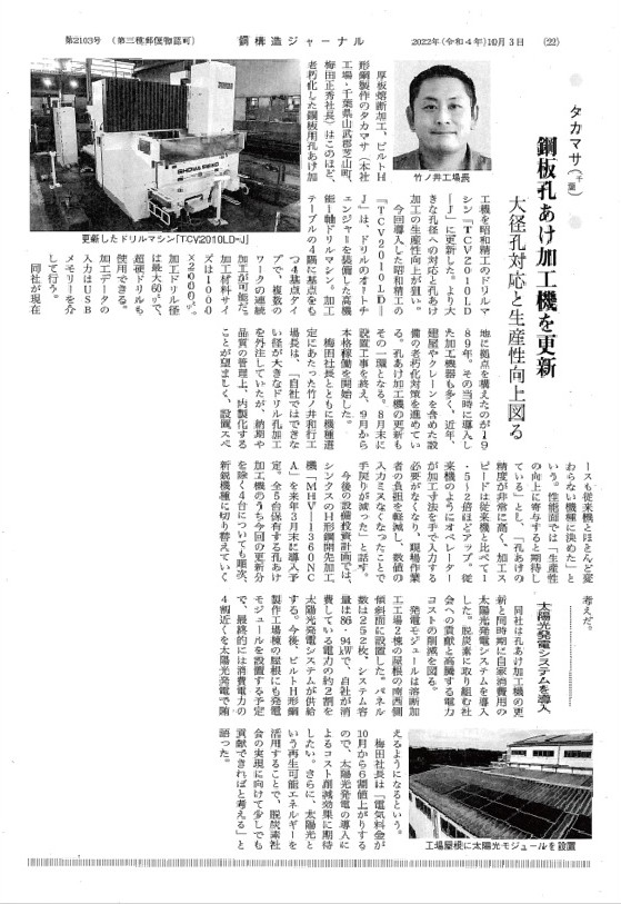 2022年10月03日付 鉄構造ジャーナルに掲載 鋼板孔あけ加工機を更新/太陽光発電システムを導入