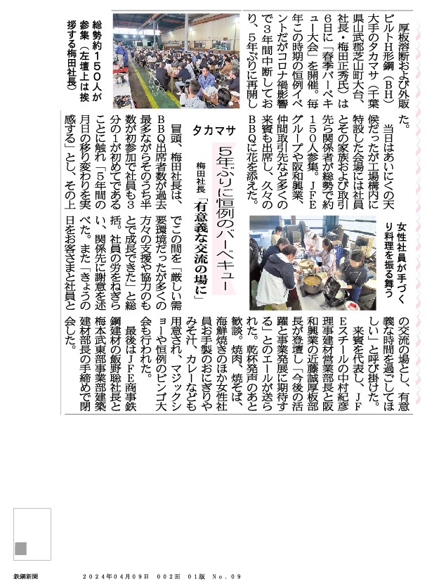 2024年04月09日付 鉄鋼新聞に掲載 5年ぶりに恒例のバーベキュー
