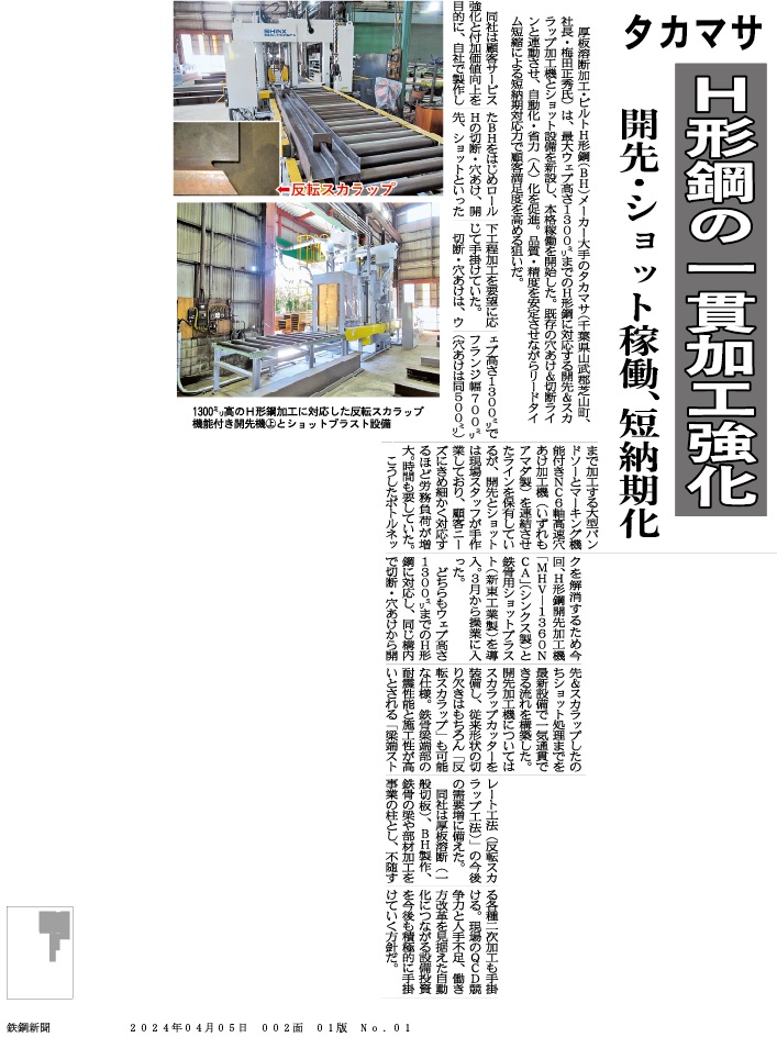 2024年04月05日付 鉄鋼新聞に掲載 H形鋼の一貫加工強化