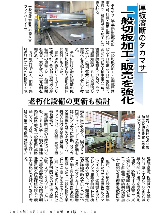 2024年04月04日付 鉄鋼新聞に掲載 一般切板加工・販売を強化